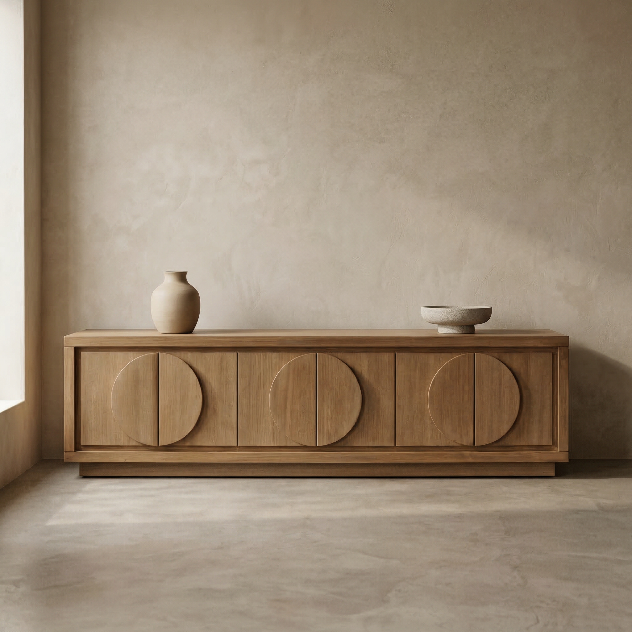 PRODUKTDETAILS : Die beste Möglichkeit, Ihrem Wohnraum Tiefe und Funktionalität zu verleihen, ist die Wahl von Produkten mit natürlicher Textur. Dies ist ein atemberaubendes Stück und die perfekte Mischung aus Retro- und zeitgenössischen Möbeln. Das TV-Möbel aus Holz von Berche ist ein stilvoller Aufbewahrungsort für Ihr Zuhause.