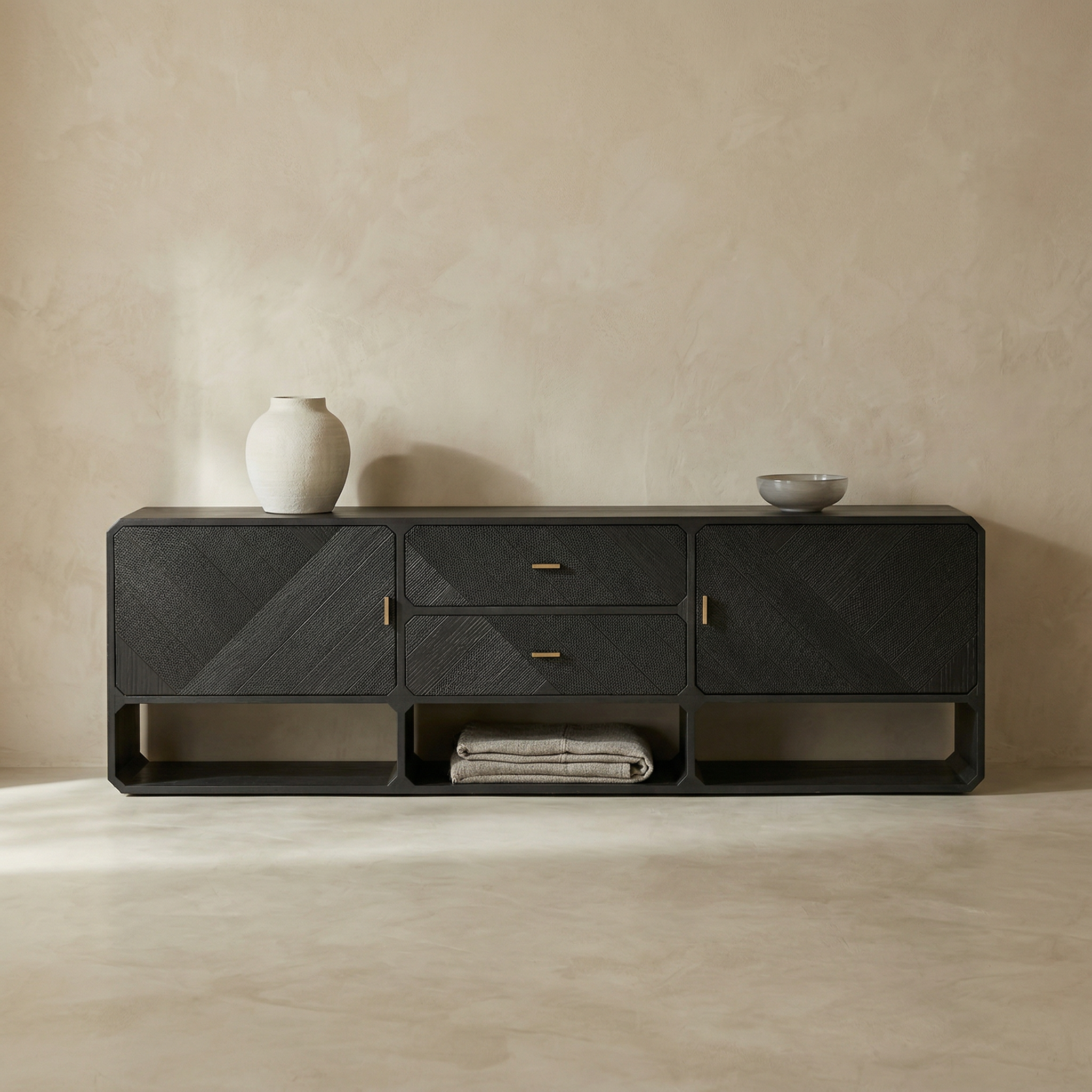 PRODUKTDETAILS : Die beste Möglichkeit, Ihrem Wohnraum Tiefe und Funktionalität zu verleihen, ist die Wahl von Produkten mit natürlicher Textur. Dies ist ein atemberaubendes Stück und die perfekte Mischung aus Retro- und zeitgenössischen Möbeln. Das TV-Möbel aus Holz „Gabriella“ ist ein stilvoller Aufbewahrungsort für Ihr Zuhause.