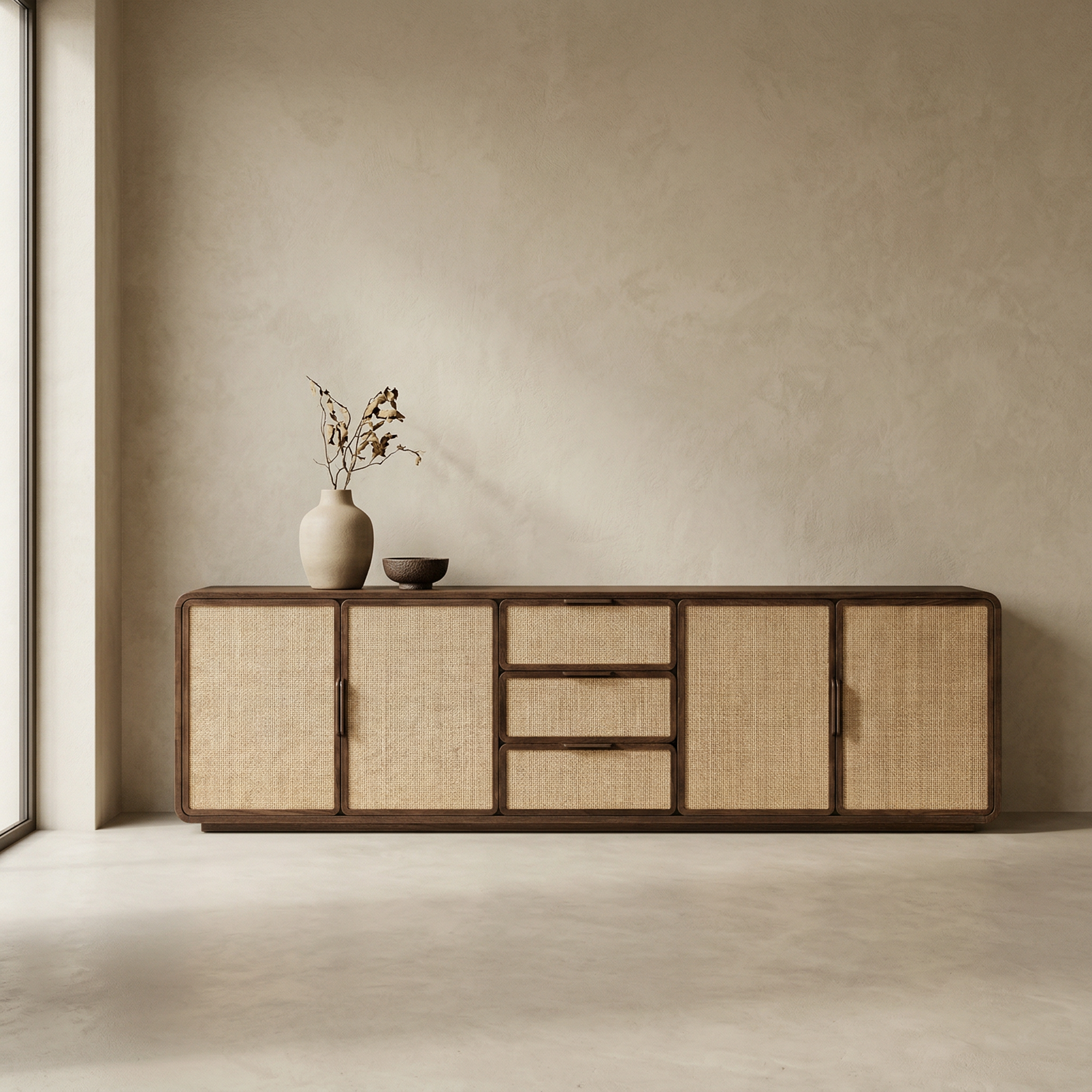 Es besteht aus ofengetrocknetem Massivholz mit amerikanischem Walnussfurnier. Es verfügt über einen handgefertigten Rahmen aus Massivholz, der von erfahrenen Händen hergestellt wurde. Die Innenteile des Abdeckrahmens bestehen aus natürlichem Rattanmaterial.