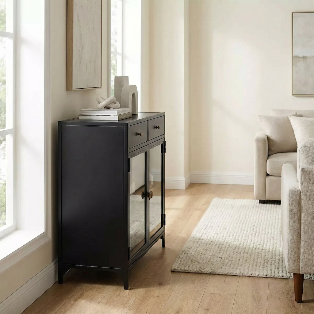 Fair Cam Detaylı Vitrin Konsol, mat siyah metal çerçeve, temperli cam kapak ve pirinç kulplarıyla koleksiyonlarınızı şık bir şekilde sergiler.