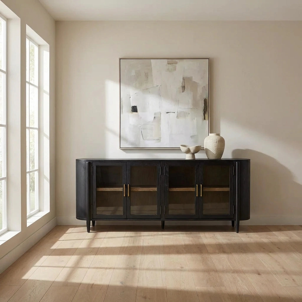 Line Cam Kapaklı Meşe Konsol, masif meşe gövde, temperli cam kapaklar ve pirinç kulplarıyla şık ve işlevsel bir depolama çözümü sunar.